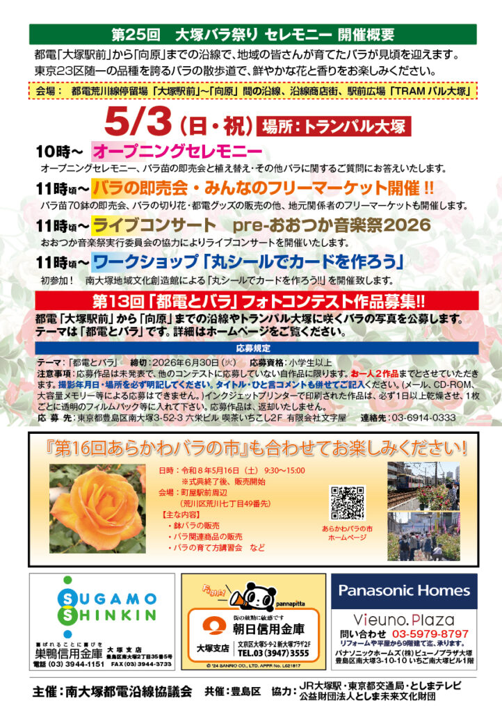 2026年春の大塚バラ祭りを5月3日から開催します。詳しくはチラシをご覧ください。